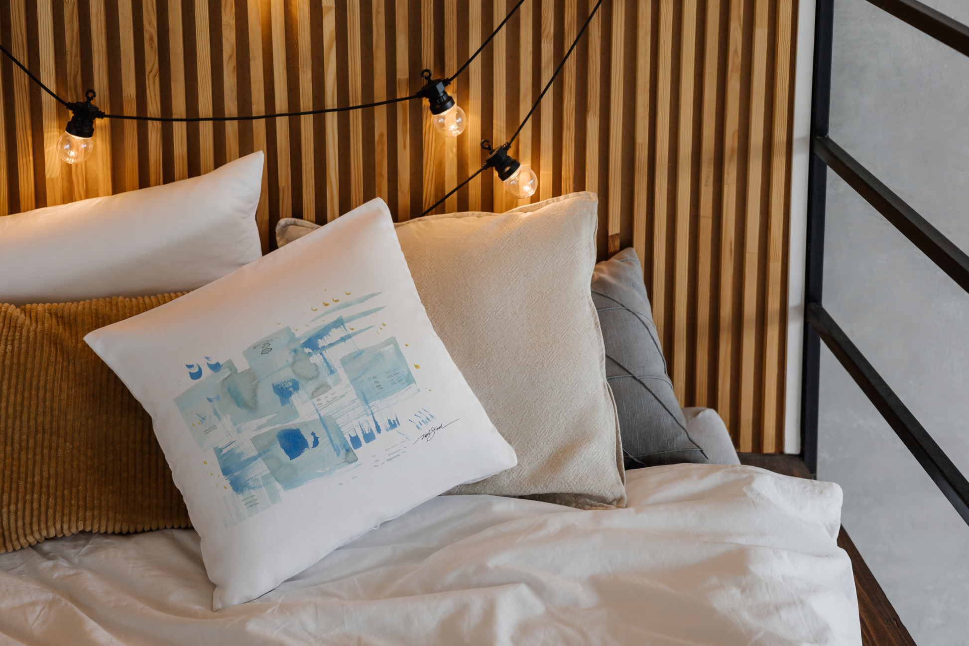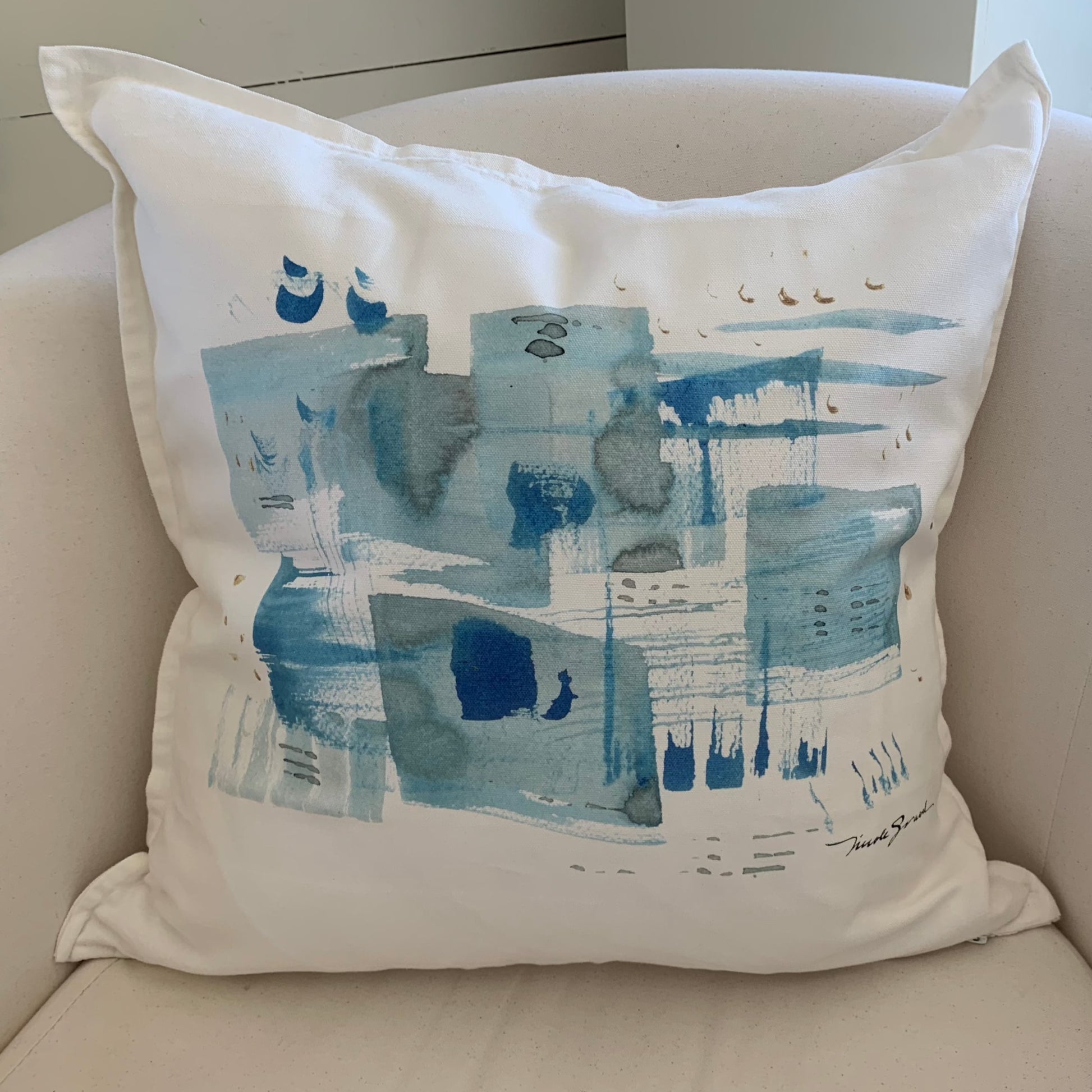 Cette housse de coussin au camaïeu de bleus tendres ajoutera à votre décor une onde marine qui déploiera une douce ambiance maritime dans votre quotidien.